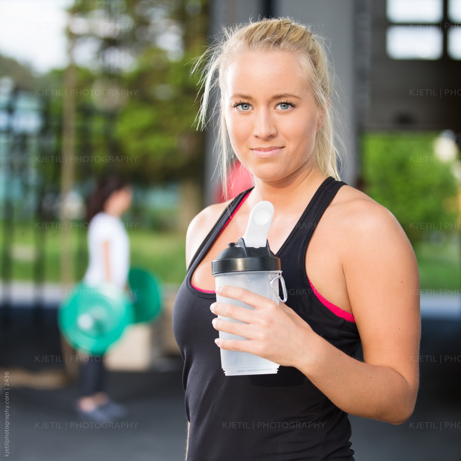 Fit and attractive blonde girl rests and drink water after workout at the gym. Fitness center in the background