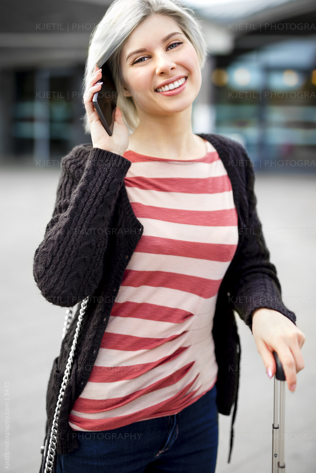 Portrait of smiling young woman talking on mobile phone outside railroad station