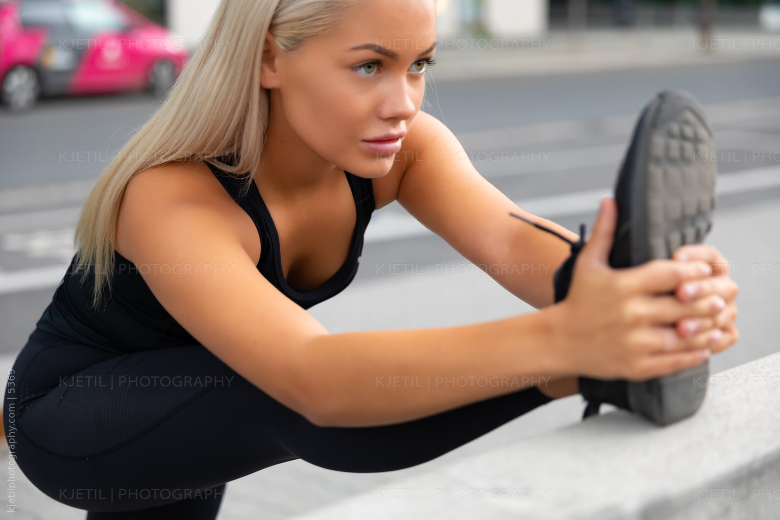 Focused Female Athlete Stretching Leg On Railing At Sidewalk