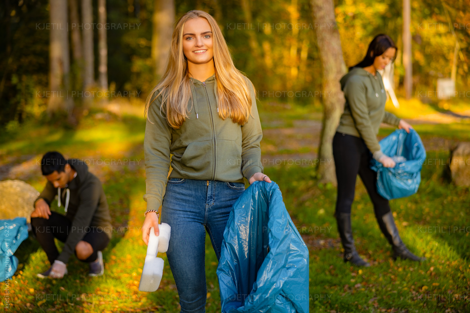 Portrait of smiling young woman holding garbage bag. Confident female volunteer is cleaning park. She is wearing casuals.