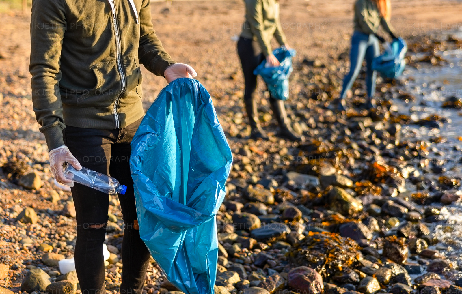 Close-up of man picking up garbage in bag. Multi-ethnic group of volunteers are cleaning beach against sky. They are protecting environmental from damage.