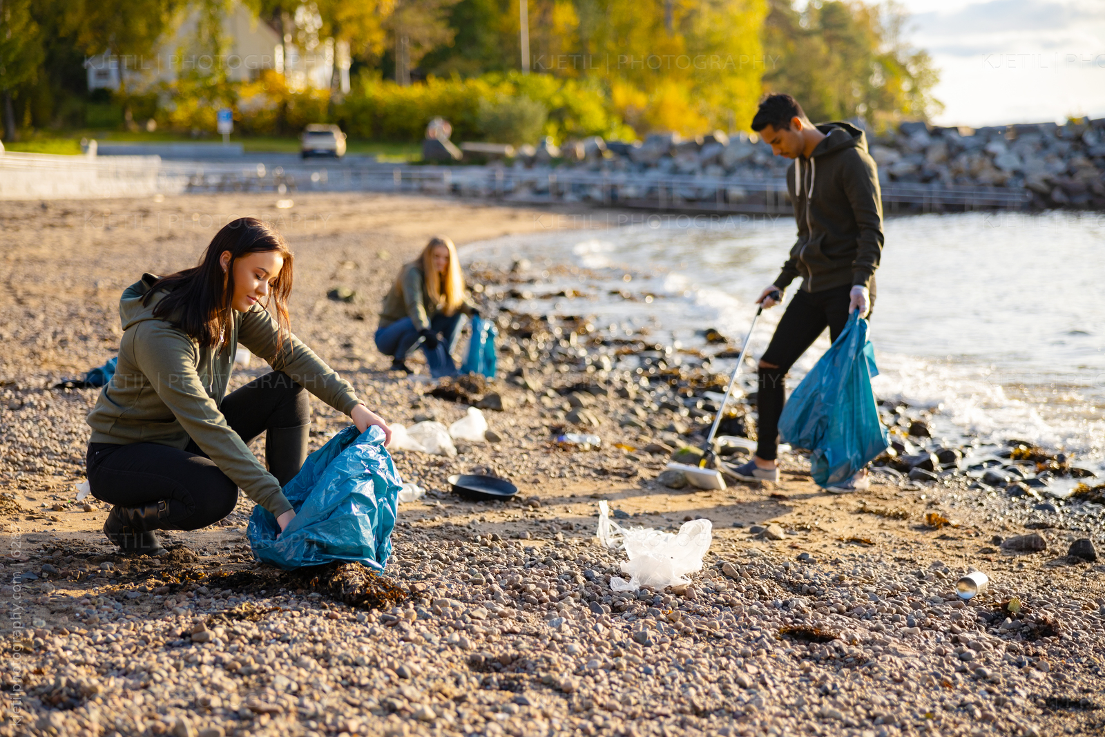 Woman in team picking up garbage in bag at beach. Volunteers are cleaning rocky shore on sunny day. They are dedicated towards protecting nature.