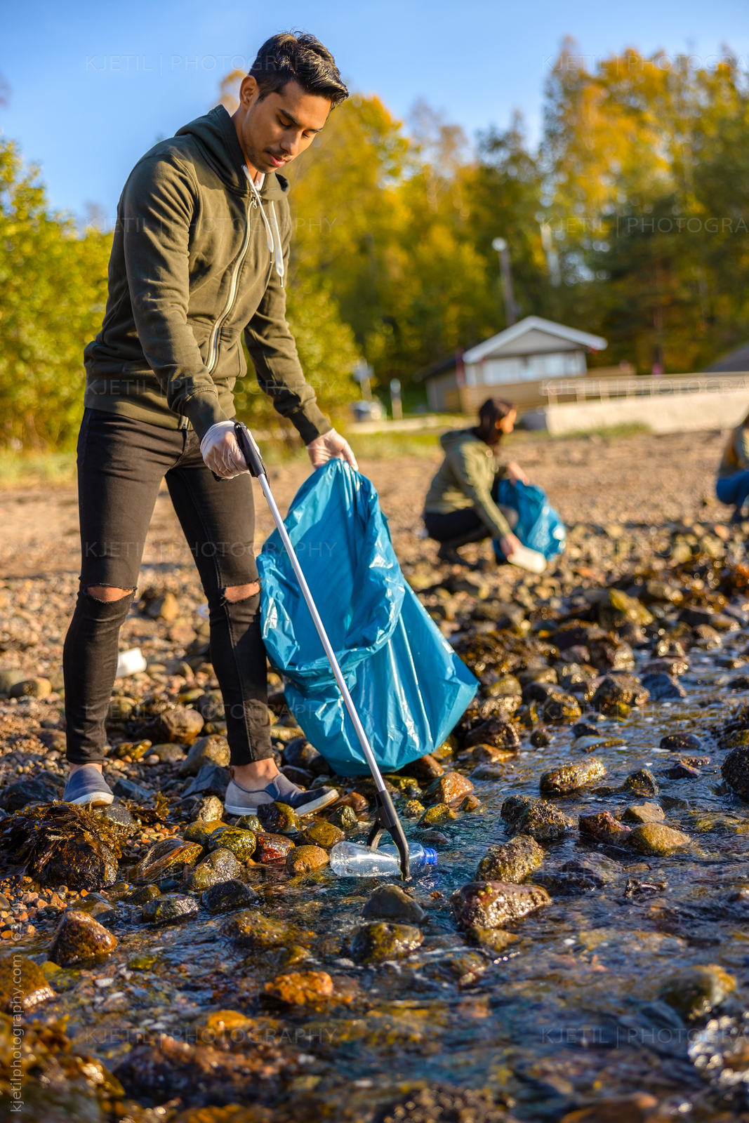 Full length of young man picking up garbage with grabber from rocks. Volunteer is cleaning beach against sky on sunny day. He is protecting environmental from damage.