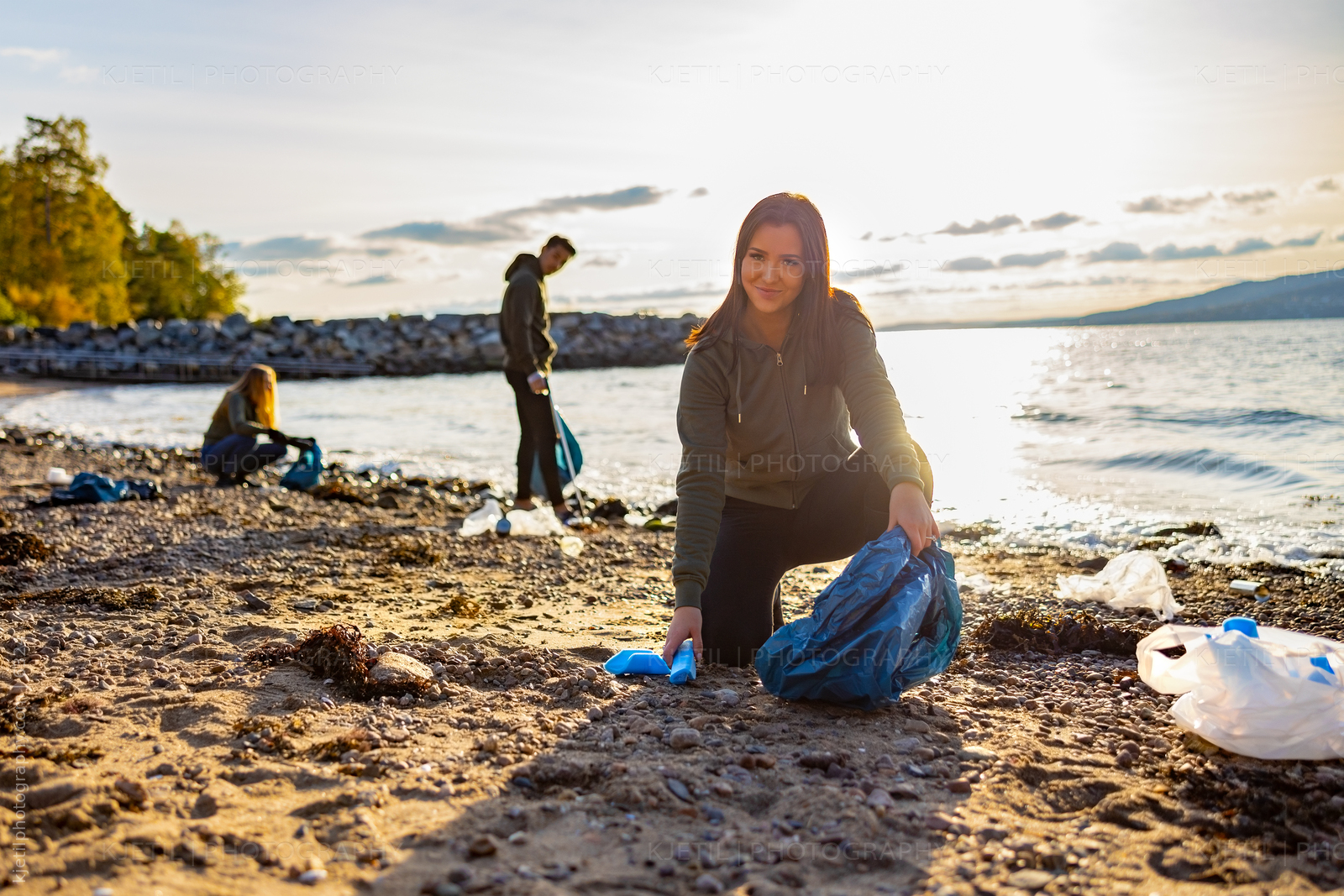 Smiling young woman cleaning beach with volunteers during sunset