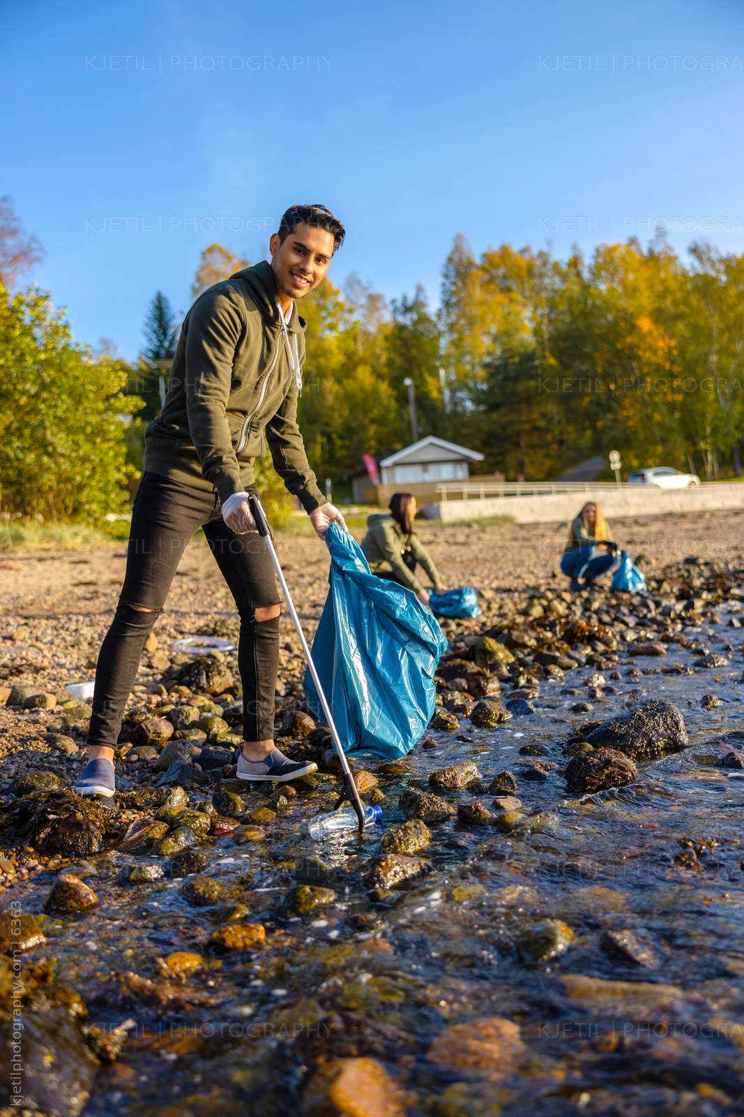 Full length portrait of smiling young man picking up garbage in bag. Multi-ethnic volunteers are cleaning beach and ocean. They are protecting environmental from damage.