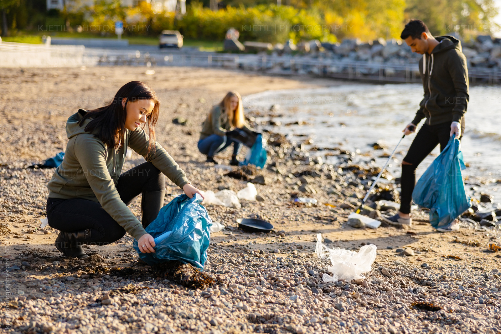 Young woman picking up garbage in bag at beach. Volunteers are cleaning rocky shore on sunny day. They are dedicated towards protecting nature.