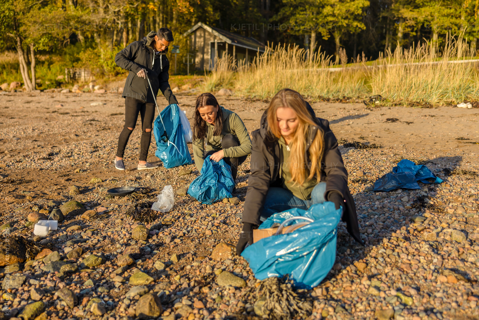 Group picking up garbage. Volunteers cleaning beach and sea. Group protecting environmental from damage.