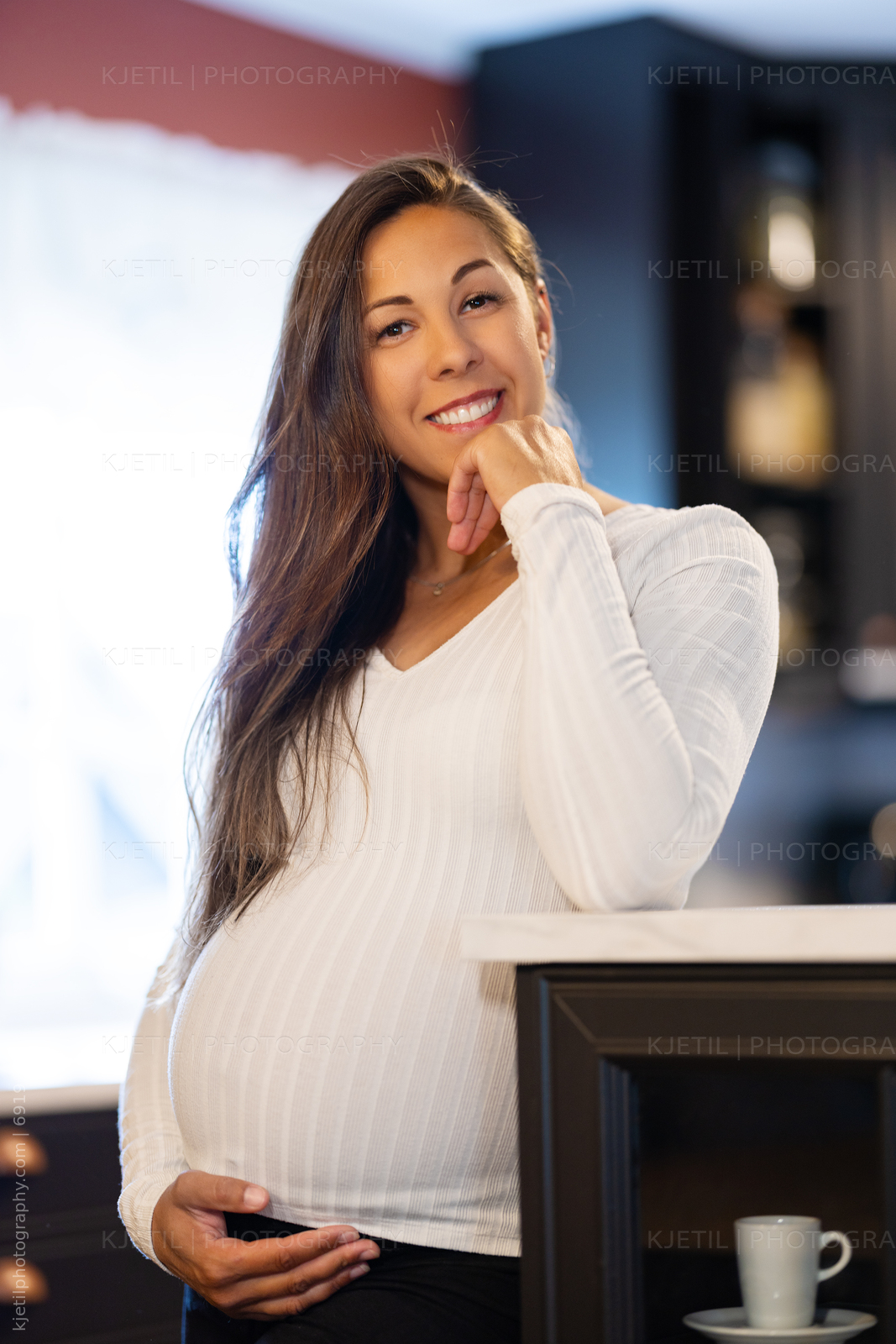 Smiling Pregnant Woman Touching Her Pregnant Belly in the Kitchen