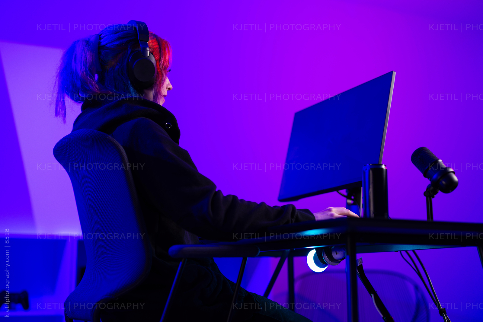 A young woman in her early twenties, with colorful hair, immersed in gaming and live streaming. The vibrant lighting and stylish setup enhance the modern ambiance of her e-sports environment, showcasing focus and dedication. Perfect for illustrating modern gaming culture and professional female streamers.