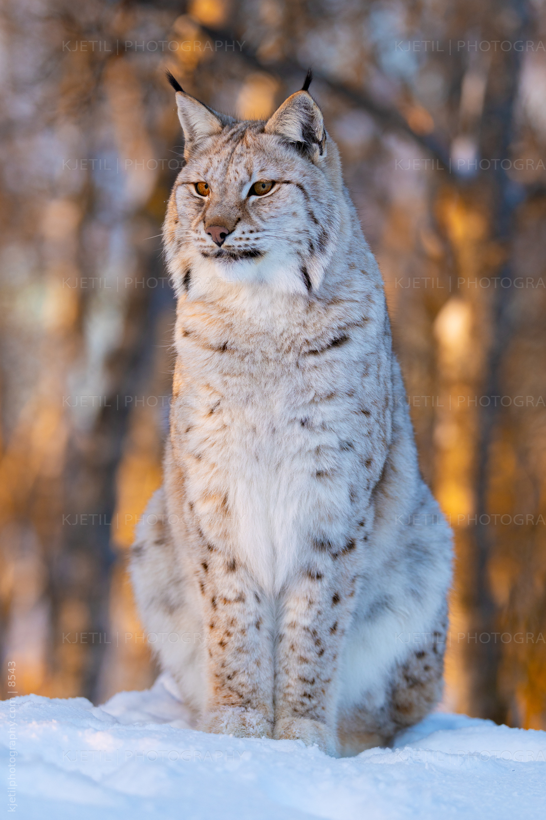 A majestic lynx sits gracefully on snowy terrain, framed by a scenic winter forest. The soft sunlight reflects off its sleek fur, highlighting its striking features and sharp ears. This image captures the beauty of wildlife in its natural habitat, evoking a sense of tranquility and awe for nature's wonders.