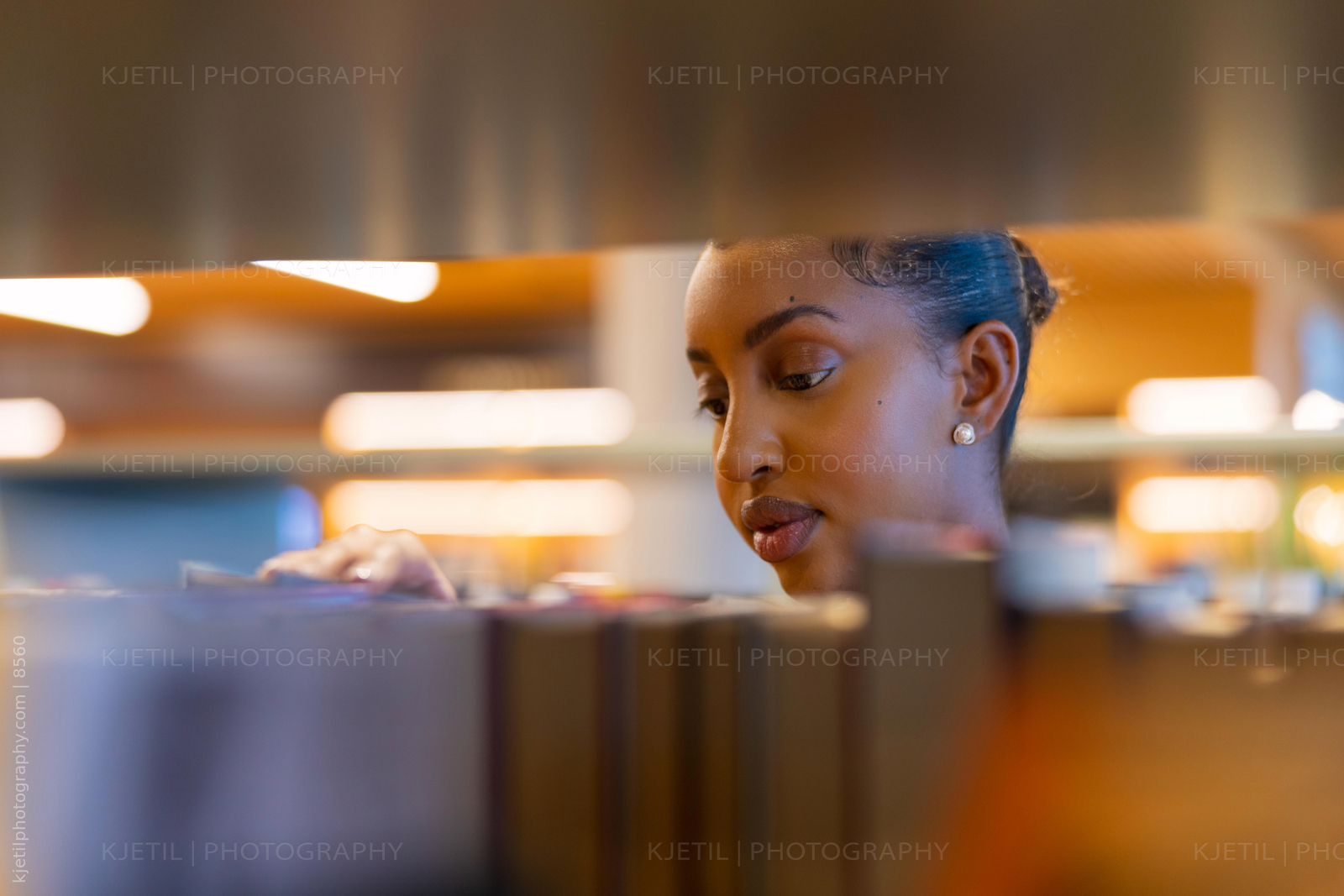 A young student concentrates on selecting a book from a library shelf. The warm lighting emphasizes the studious atmosphere while showcasing a sense of curiosity and learning. This image embodies education, focus, and academic pursuit, ideal for representing knowledge, scholarship, and educational resources.