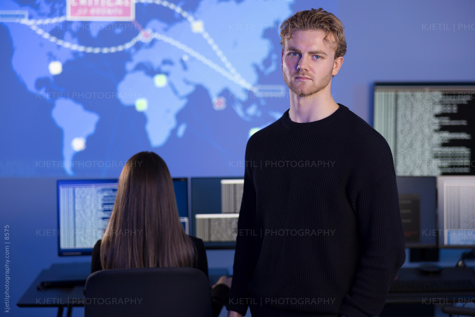A cybersecurity team monitors and investigates network traffic in a SOC environment. The front screens display active logs and alerts, while digital dashboards depict a global network map with markers. A focused male analyst, in his 30s, collaborates with a female counterpart. The image emphasizes teamwork, technology, and real-time threat detection.