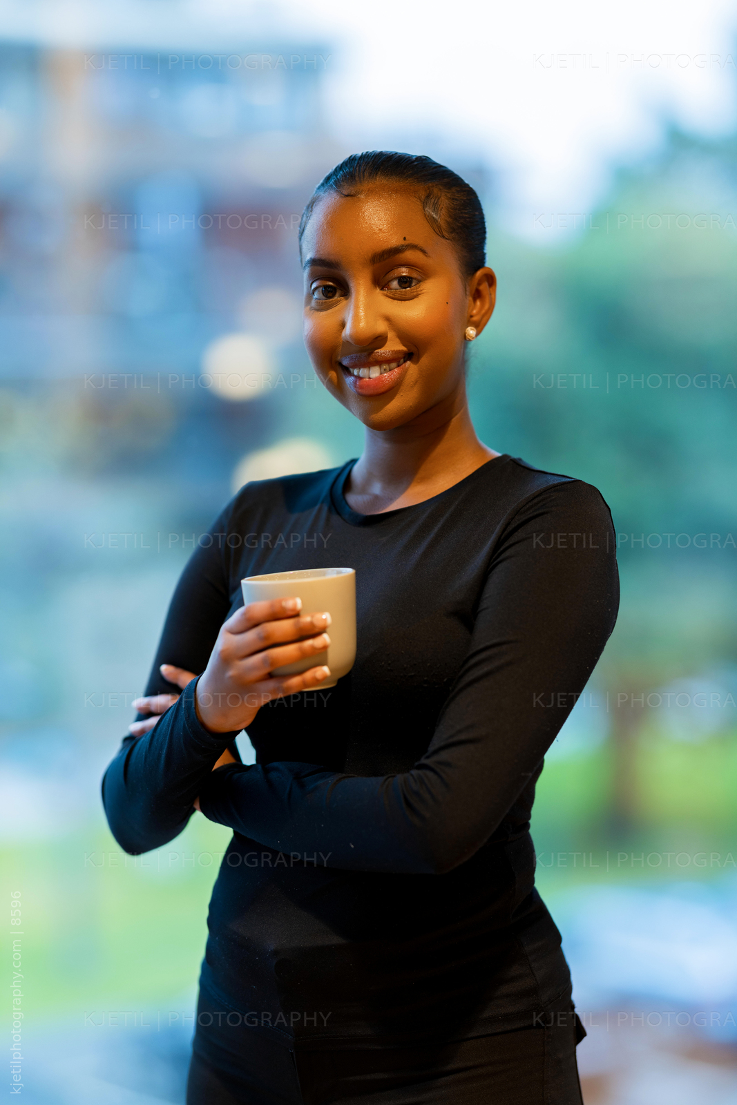 A confident woman enjoys a warm drink indoors, dressed in a casual black outfit. She smiles warmly with a modern cityscape providing a soft, blended background. This image conveys relaxation, positivity, and a sense of calmness, making it ideal for illustrating lifestyle, confidence, or professional themes.