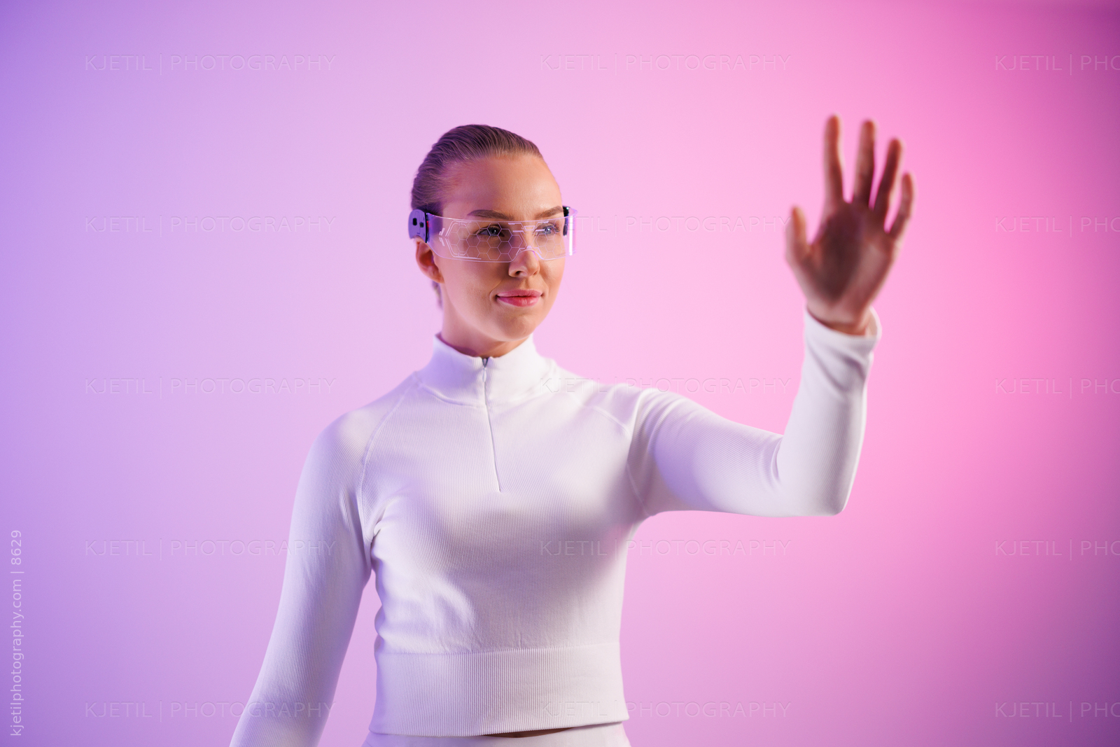 Female in smartglasses against colored background
