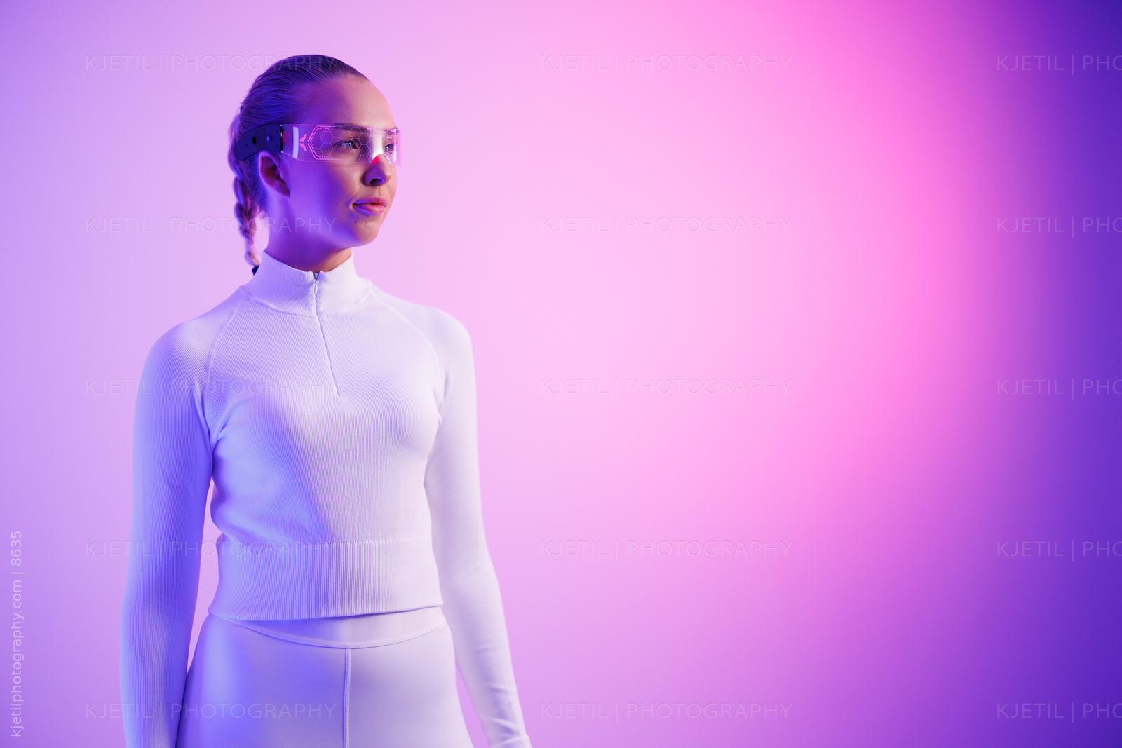 Woman in smartglasses standing against purple background