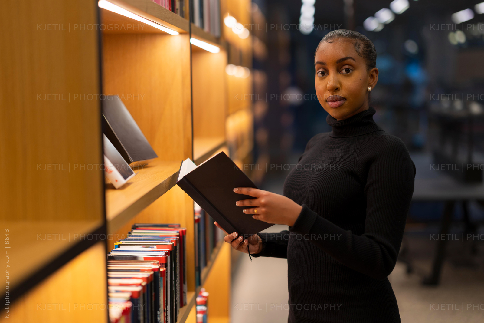 A dedicated student stands in a library aisle, picking a book from the shelf while focused on her studies. The warm, inviting lights illuminate the shelves filled with knowledge, creating an atmosphere of focus and learning. The individual appears engaged and ready for academic pursuits in this calm and studious environment.