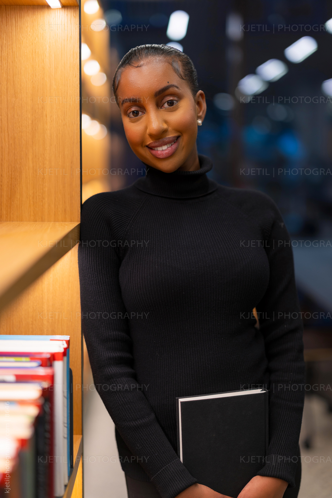 A friendly student holds a book while standing beside a bookshelf in a well-lit library. The warm atmosphere and organized shelves create an ideal environment for studying, learning, or research.