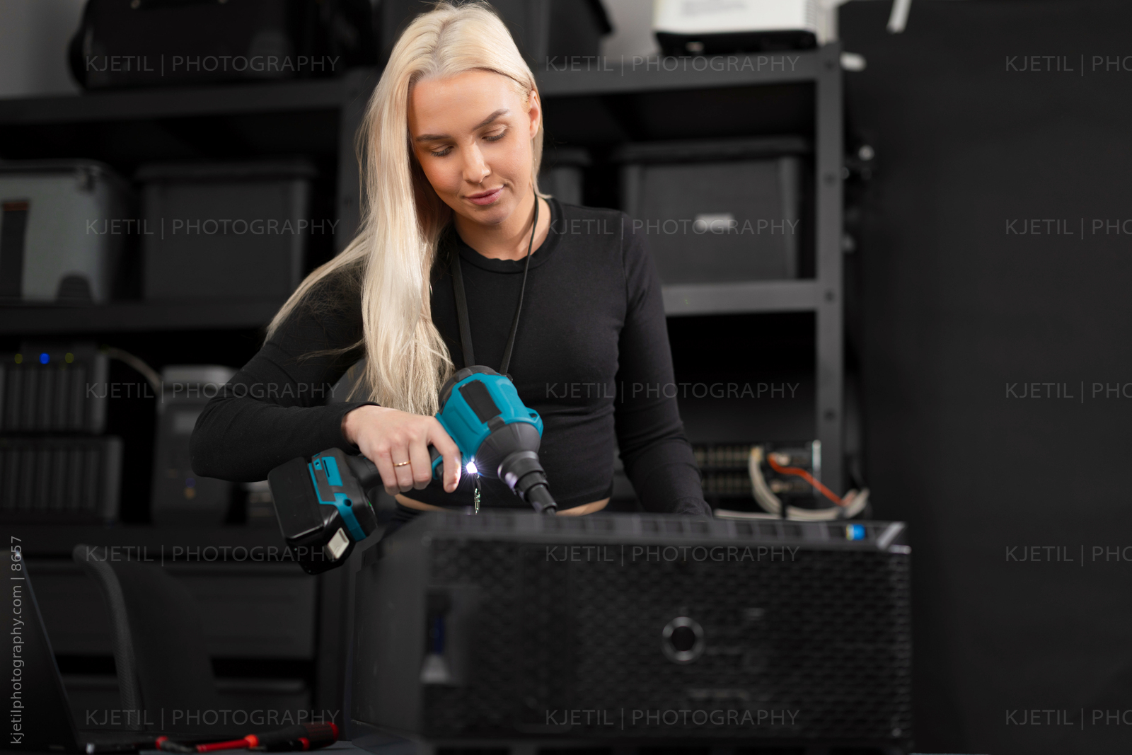 Female IT technician in a computer lab maintain and clean server hardware with a dust blower, performing maintenance