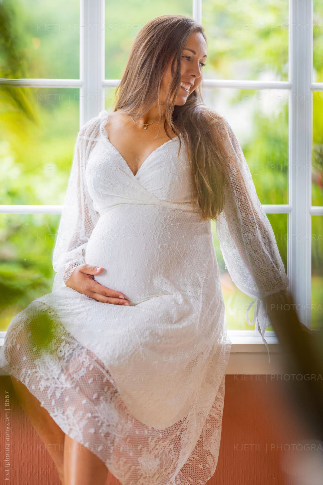 Pregnant woman in lace dress smiling while enjoying natural light by a window