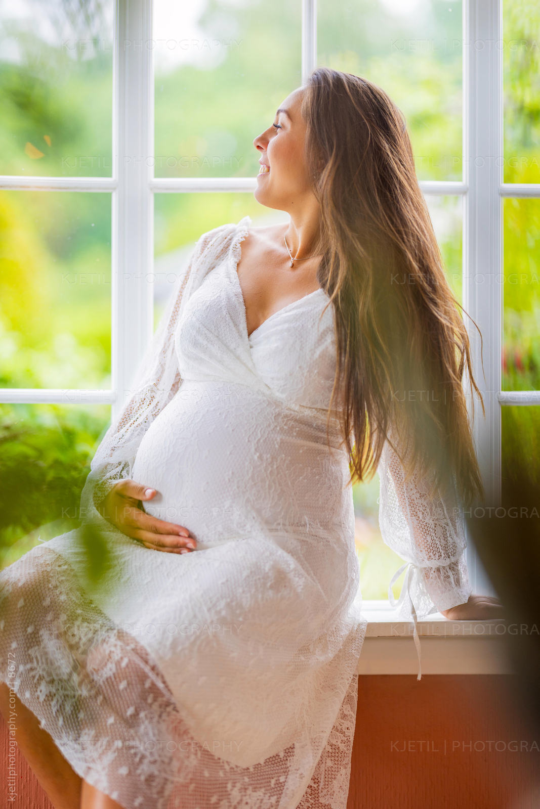 A serene moment of a pregnant woman in a white dress, basking in sunlight near a window, radiating peace and anticipation. A celebration of motherhood and the beauty of pregnancy.