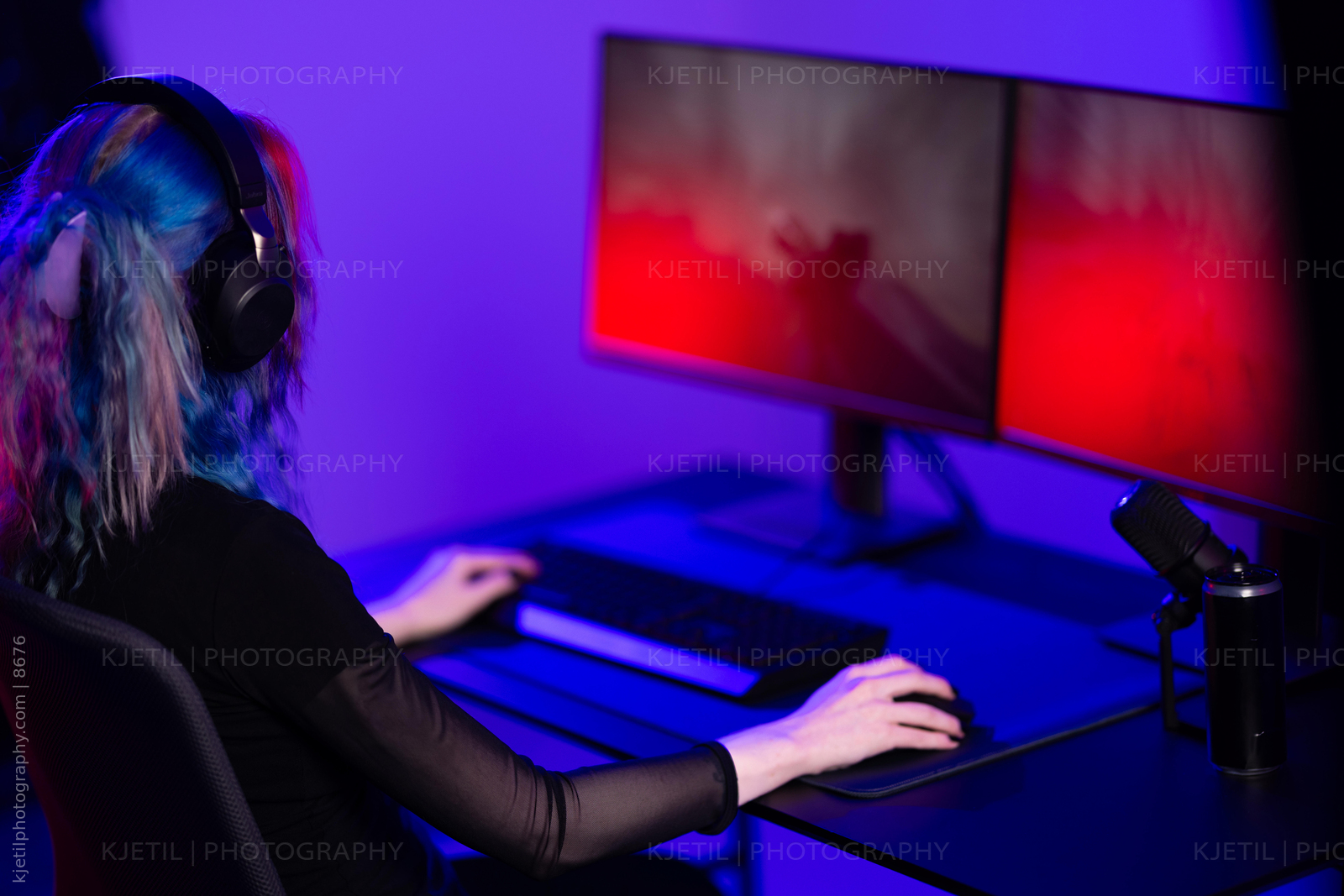 A young female gamer engages in professional gaming using high-end equipment and dual monitors. The atmospheric purple and red lighting enhances the immersive gaming experience, with a microphone indicating potential live streaming. This scene captures modern gaming culture, featuring focus, skill, and connection through technology.