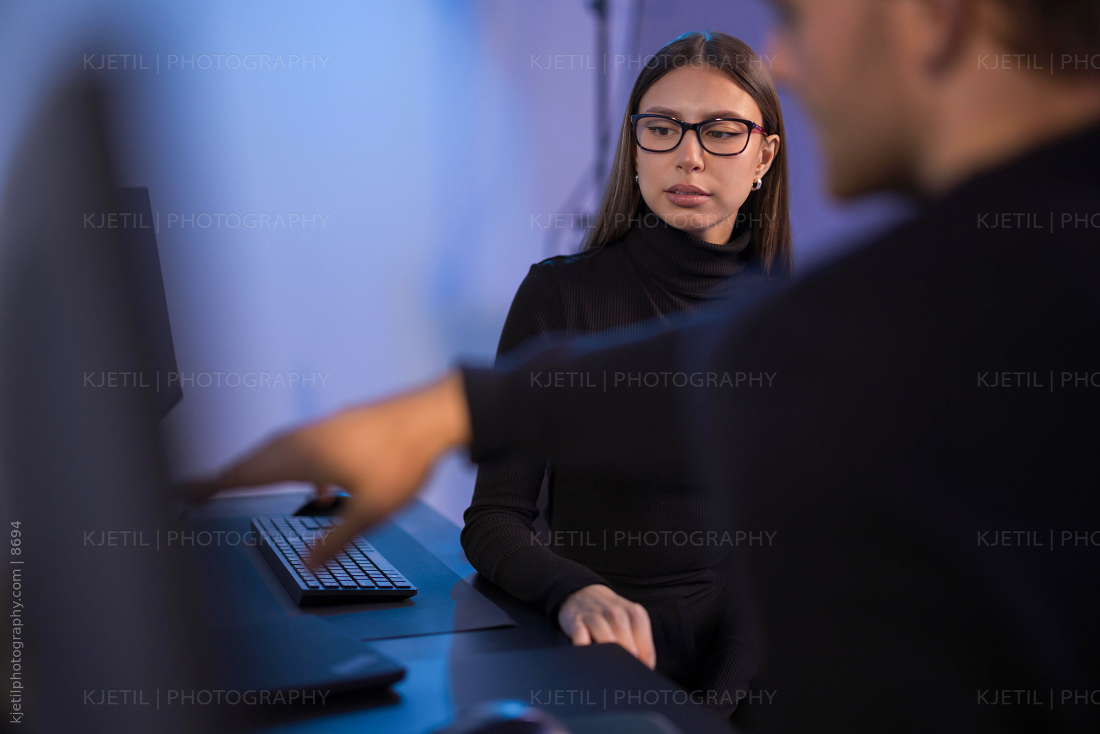 A young woman engaged in a professional discussion in a modern office environment. The team is collaborating on technological improvements, with one individual gesturing towards a computer screen. The atmosphere reflects innovation and teamwork.