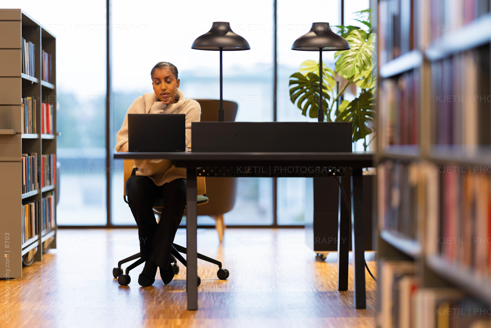 A student sits at a desk in a well-lit library, working on a laptop. The background includes bookshelves, large windows, and a modern interior design, creating a calm and productive study environment. The individual appears focused and engaged in their academic tasks.