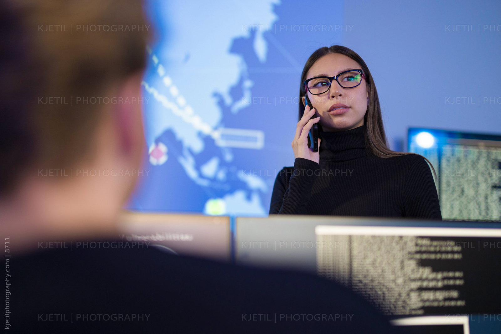 A professional female cybersecurity analyst communicating on a phone in a control room. The environment is equipped with multiple monitors displaying data and maps, symbolizing real-time threat detection and management. This image portrays a coordinated effort in cybersecurity operations, emphasizing vigilance and responsiveness in a technical setting.