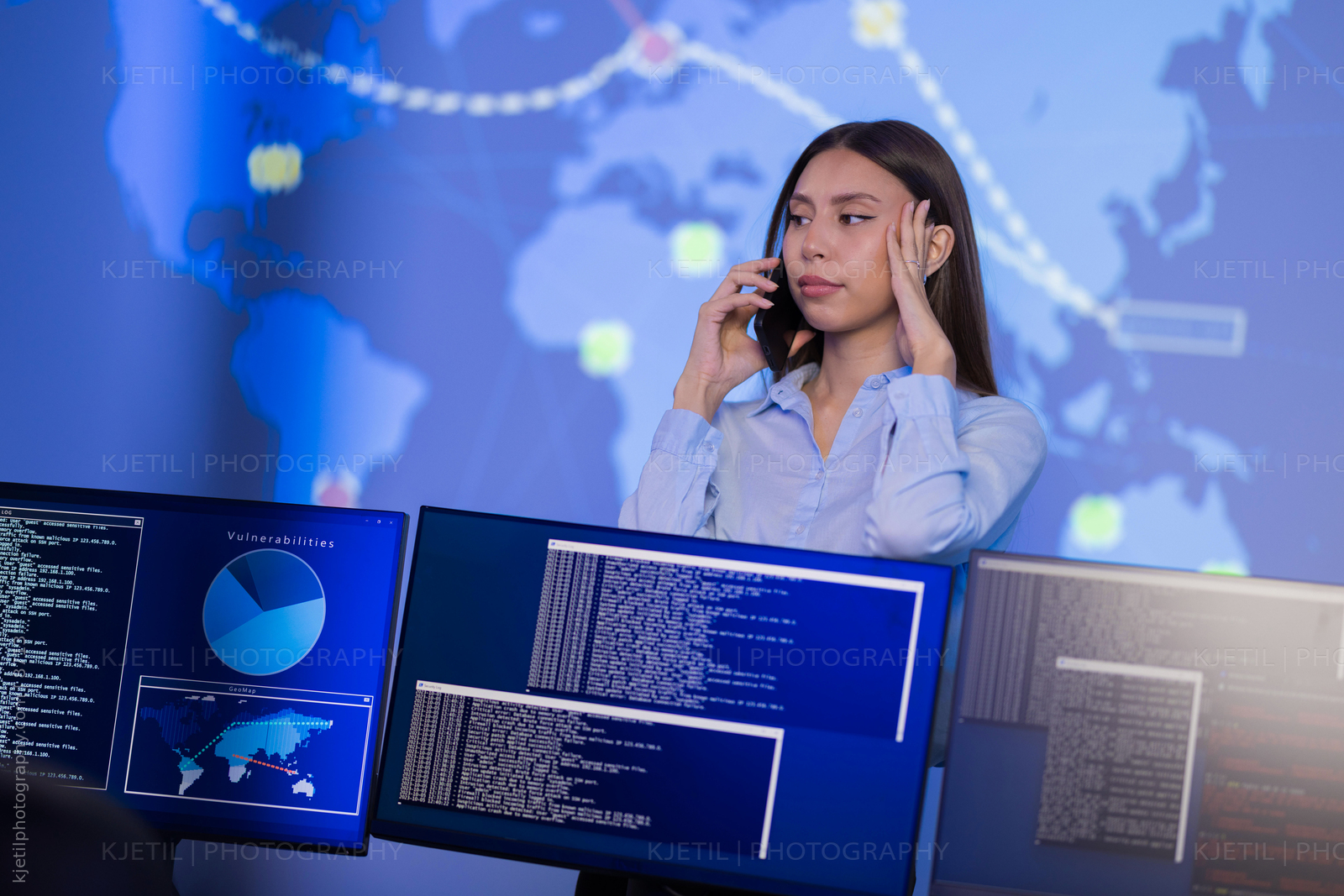 A young professional woman works as a cybersecurity analyst in a control room. She is seen monitoring multiple data screens displaying security logs and vulnerability charts against a global map. Her focused expression highlights her dedication to real-time threat detection and vulnerability management for safeguarding digital environments.
