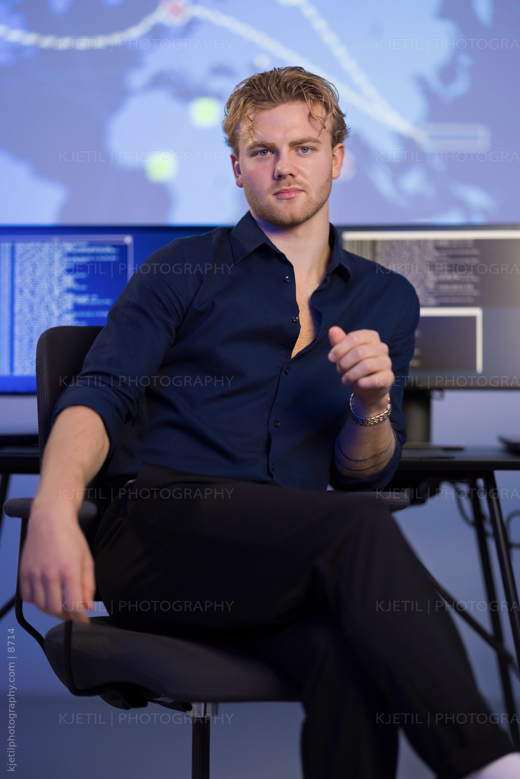 A young adult male in a tech control room, confidently posing on a chair. He is wearing a dark, stylish shirt and is surrounded by displays showcasing digital maps and data. The scene emphasizes professionalism, technology, and a dynamic workspace perfect for cybersecurity, monitoring, or analyst roles.