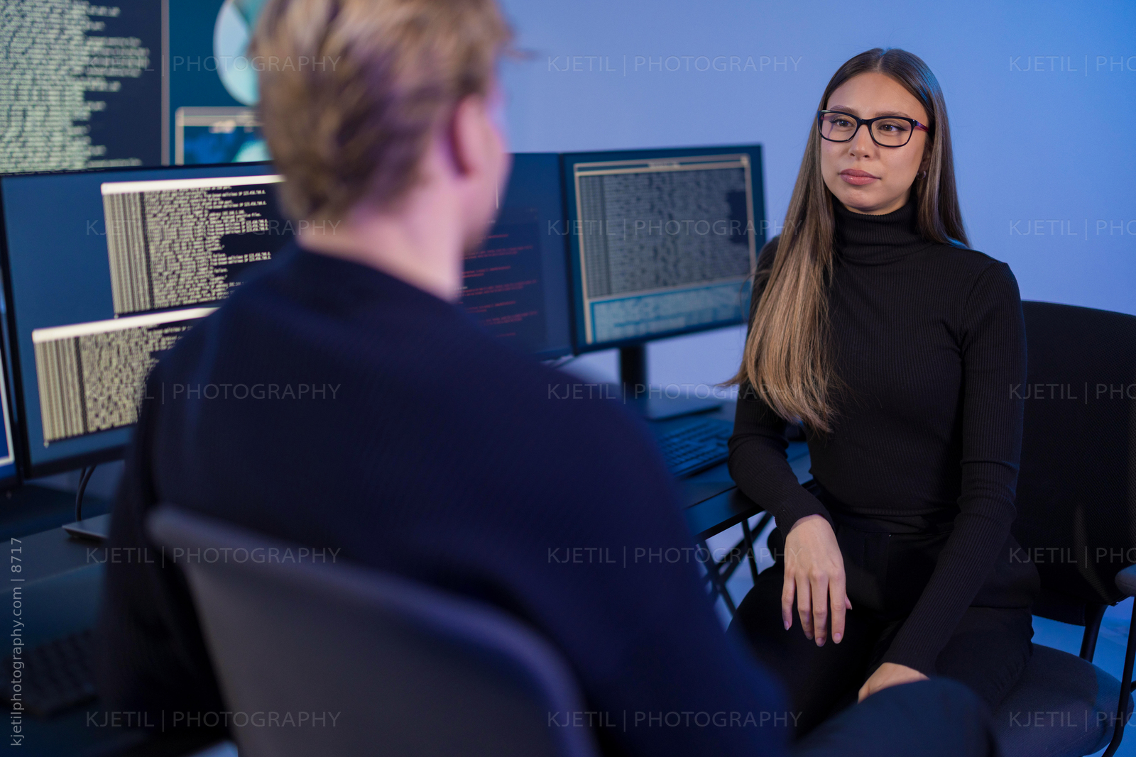 Two cyber analysts, a woman and a man, collaborating in a secure office setting. They monitor and analyze data displayed on multiple computer screens. The environment represents a high-tech operations center dedicated to IT security, real-time threat detection, and system monitoring.
