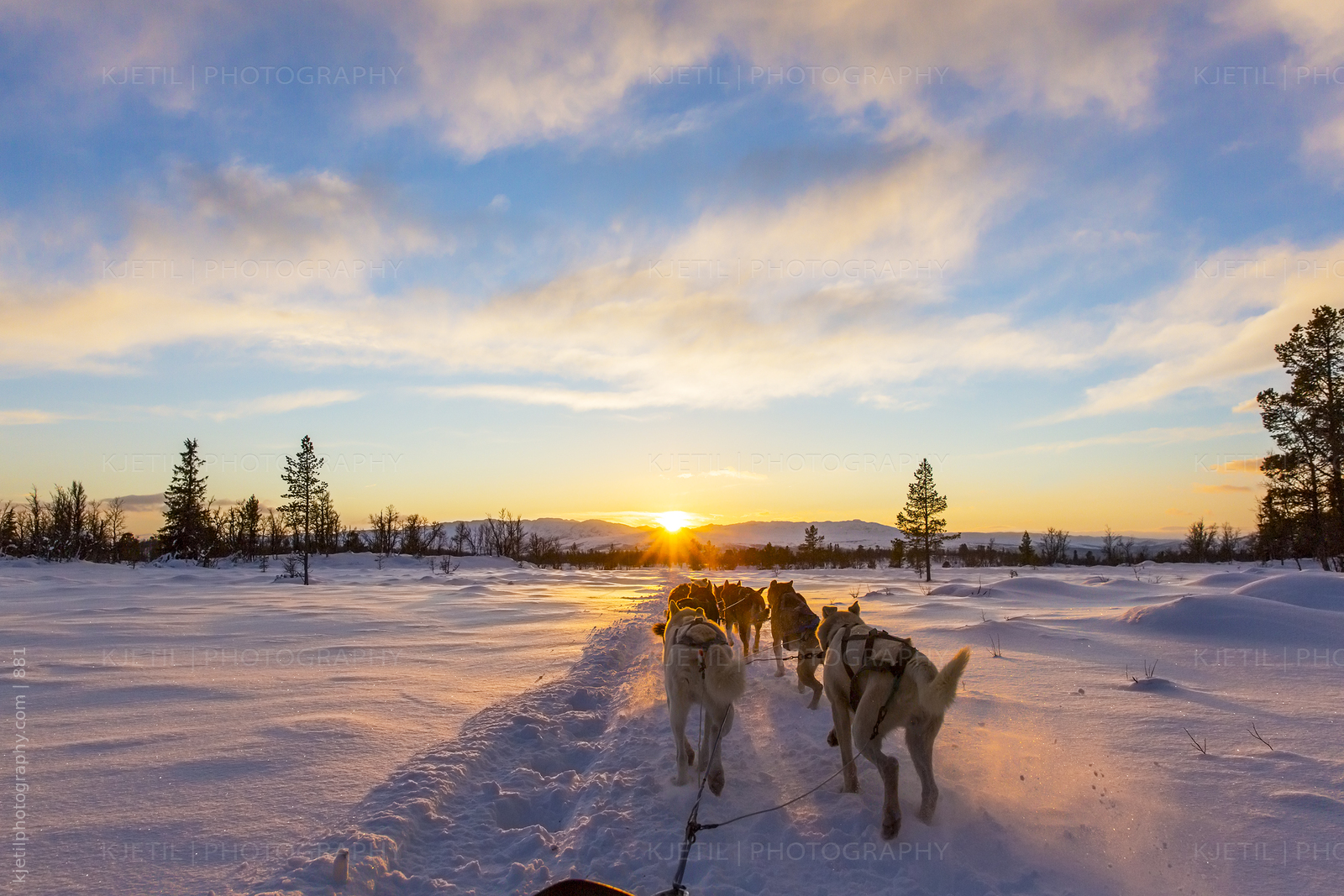 Musher and passenger in a dog sleigh with huskies a cold winter evening.
